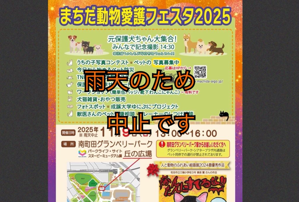 2025年11月9日(日)に 南町田グランベリーパーク 丘の広場にて開催予定の 『まちだ動物愛護フェスタ2025』は 悪天候のため中止とさせていただきます。 また、来年お会いしましょう! -