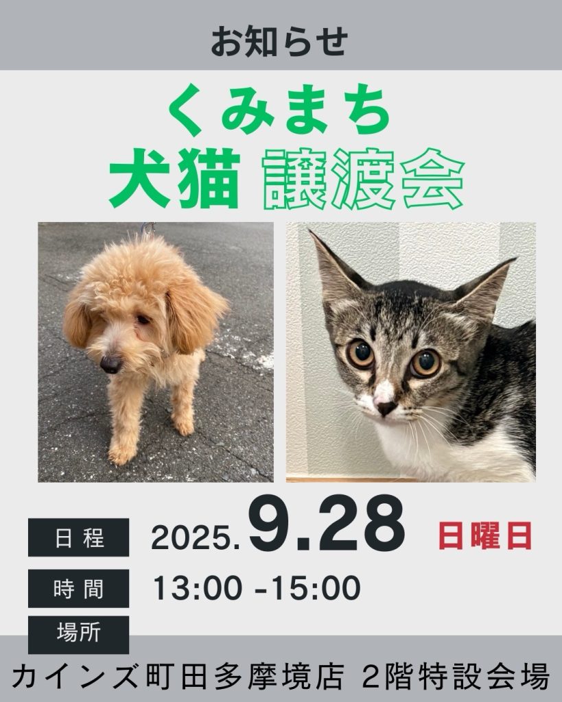 9月28日(日)13:00-15:00 場所:カインズ 町田多摩境店 2階 エレベーターホール東京都町田市小山ヶ丘3丁目6 <お願い> 係員の指示に従い犬猫をご覧頂きます。 混み合う場合には少しお待ちいただくことも予想されますので時間に余裕を持ってお越しください... -