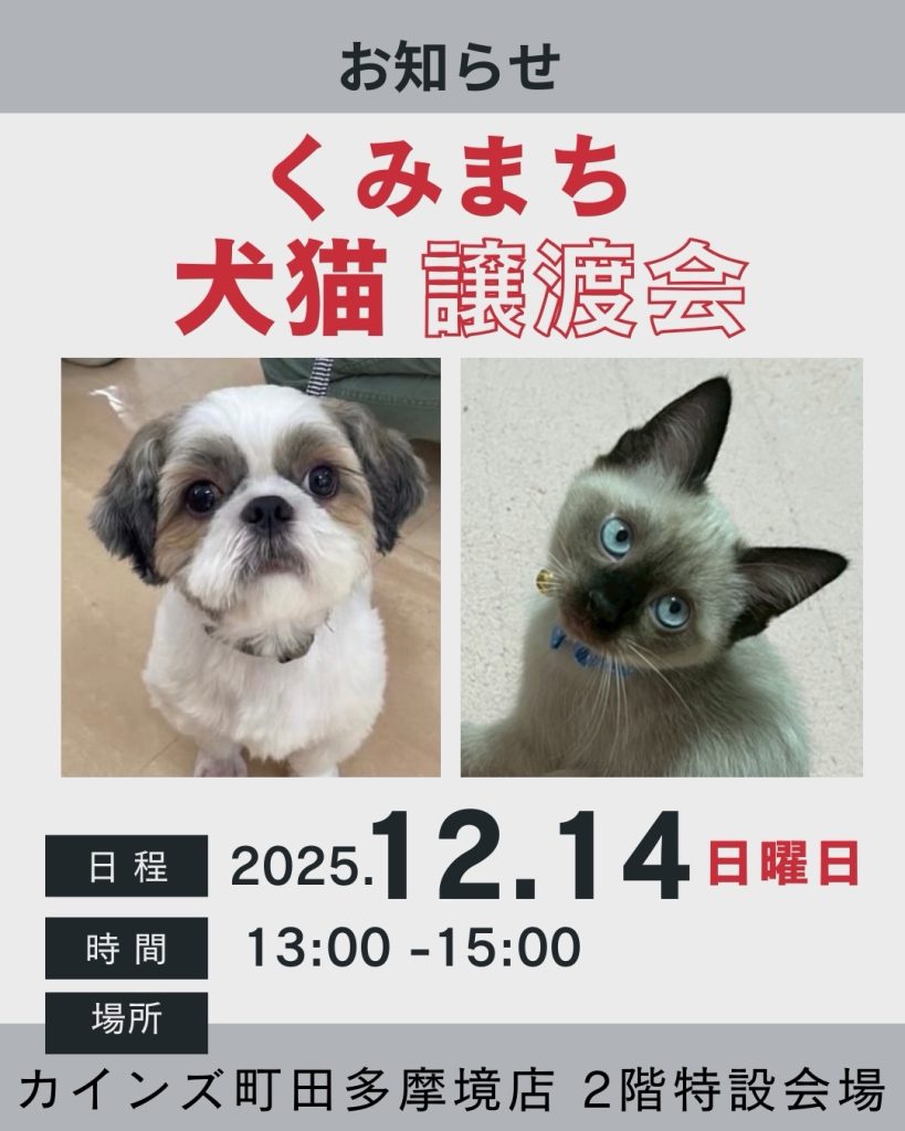 12月14日(日)13:00-15:00 場所:カインズ 町田多摩境店 2階 エレベーターホール東京都町田市小山ヶ丘3丁目6 <お願い> 係員の指示に従い犬猫をご覧頂きます。 混み合う場合には少しお待ちいただくことも予想されますので時間に余裕を持ってお越しくださ... -